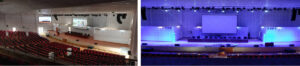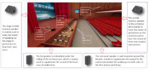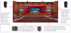 Dựa vào môi trường thực tế của hội trường và cách bố trí hệ thống loa, kết hợp phần mềm mô phỏng âm học EASE4.3 / EASE4.4, itc thiết kế hệ thống âm thanh phù hợp tiêu chuẩn quốc gia, đảm bảo mức áp suất âm chuẩn hạng nhất của hội trường ≥ 106dB. Loa được lắp đặt theo mô hình hỗn hợp để đảm bảo độ phủ âm đồng đều và chất lượng trình diễn cao nhất.